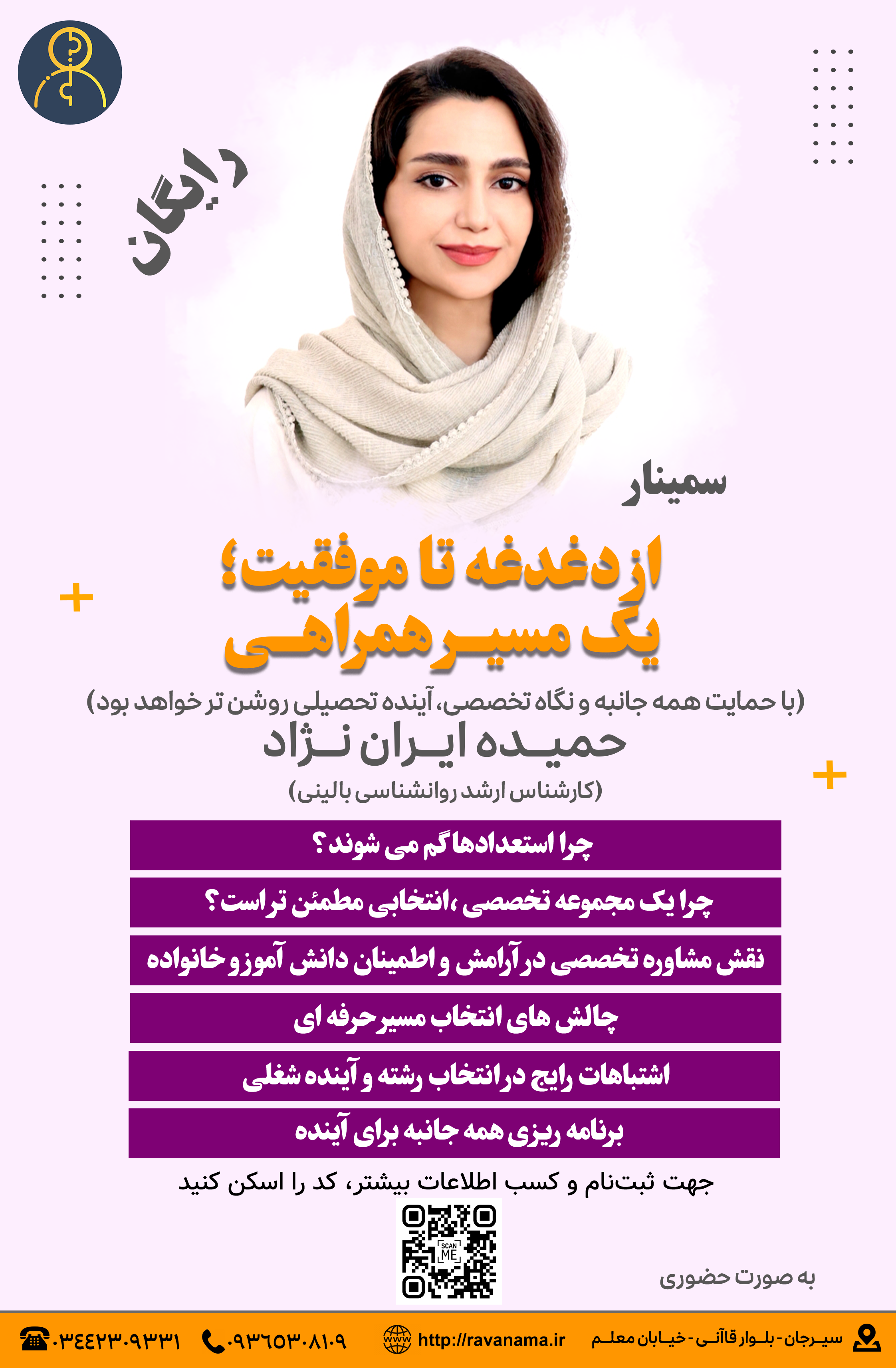 تحصیل فقط انتخاب رشته نیست؛ آینده روشن وقتی ساخته می‌شود که استعدادها، علایق، اهداف و سلامت روان در کنار هم دیده شوند. در این سمینار با همراهی روان‌شناسان و مشاوران تخصصی یاد می‌گیرید چطور مسیر تحصیلی‌تان را آگاهانه و همه‌جانبه برنامه‌ریزی کنید.